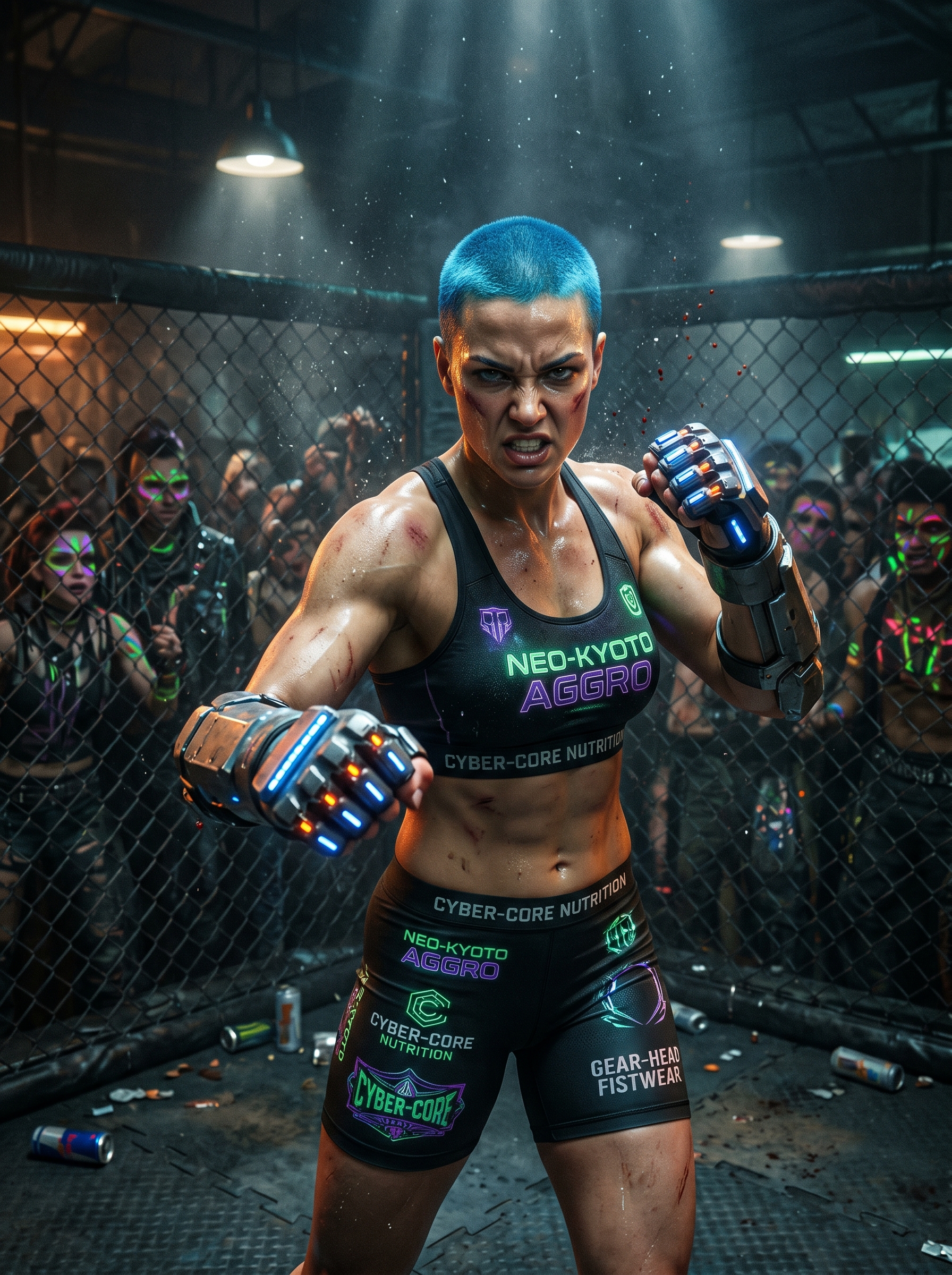 Hana, short choppy black hair with a single bleached-white streak above her left ear, sharp amber eyes with a slight upward tilt, three small silver hoop earrings on her right ear, a black fingerless glove on her left hand, compact athletic build, warm tan skin tone